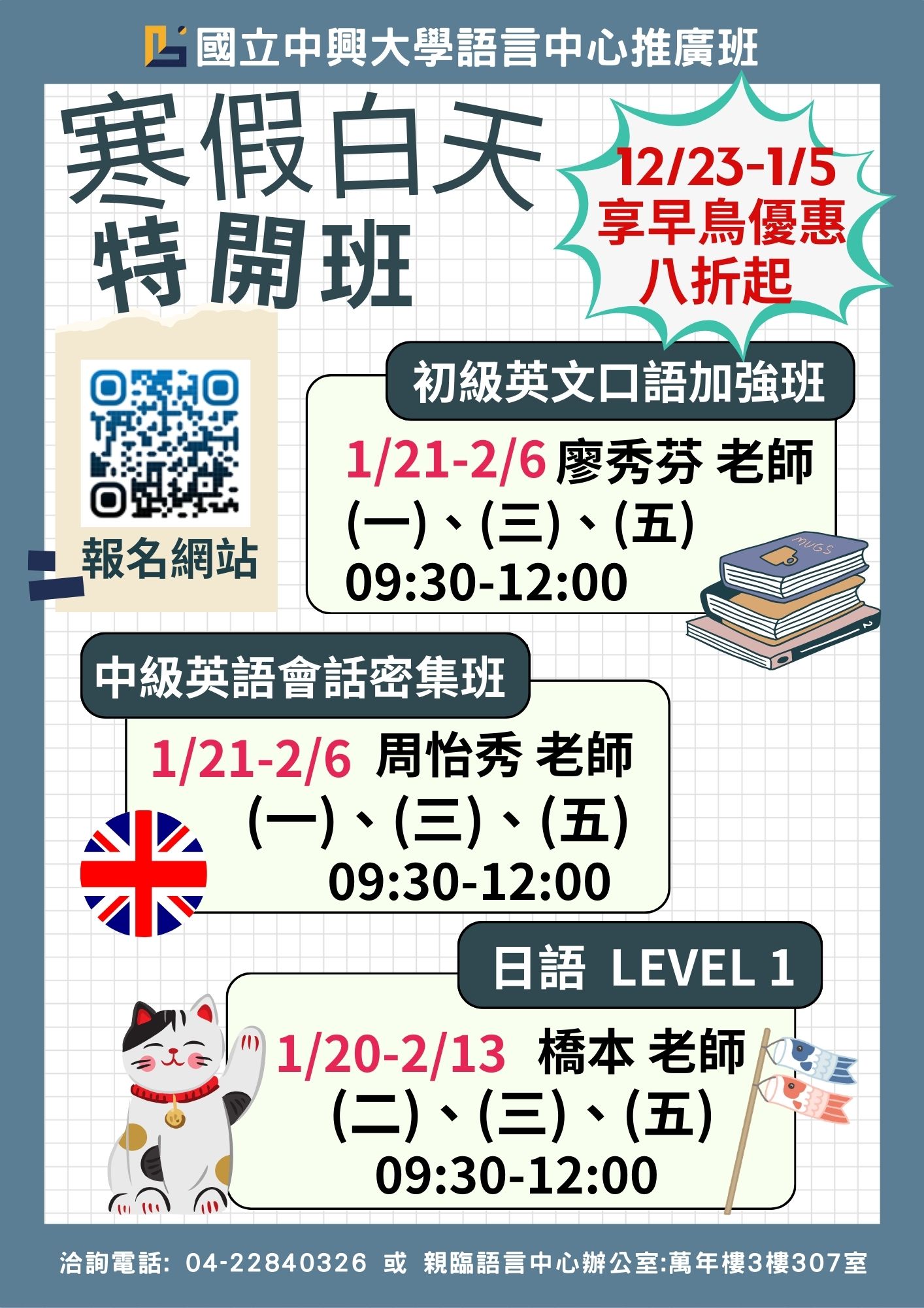 國立中興大學語言中心115年寒假及春季語言課程招生(含線上及實體課)